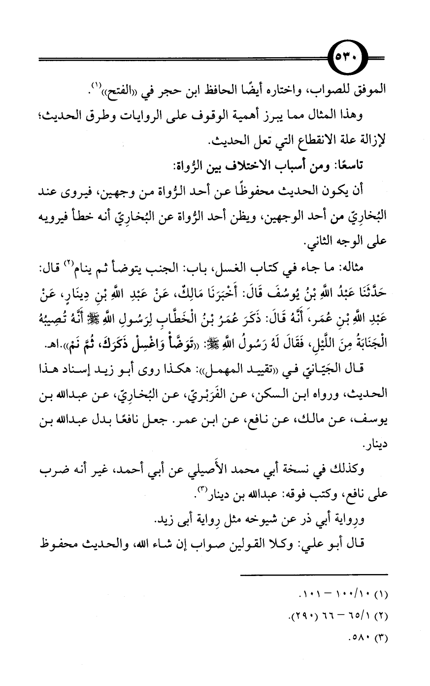 قال الجَيّانيّ في «تقييد المهمل»: هكذا روى أبو زيد إسناد هذا الحديث، ورواه ابن السكن، عن الفَرَبْريّ، عن البُخارِيّ، عن عبد الله بن يوسف، عن مالك، عن نافع، عن ابن عمر. جعل نافعًا بدل عبد الله بن دينار.