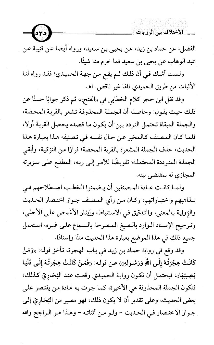 وقد وقع في رِواية حماد بن زيد في باب الهجرة، تأخرُ قوله: «وَمَنْ كَانَتْ هِجْرَتُهُ إِلَى اللَّهِ وَرَسُولِهِ») عن قوله: «فَمَنْ كَانَتْ هِجْرَتُهُ إِلَى دُنْيَا يُصِيبُهَا»، فيحتمل أن تكون رِواية الحميدي وقعت عند البُخارِيّ كذلك، فتكون الجملة المحذوفة هي الأخيرة، كما جرت به عادة من يقتصر على بعض الحديث، وعلى تقدير أن لا يكون ذلك، فهو مصير من البُخارِيّ إلى جواز الاختصار في الحديث - ولو من أثنائه - وهذا هو الراجح والله