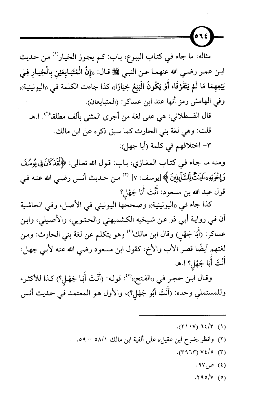 كذا جاء في «اليونينية» وصححها اليونيني في الأصل، وفي الحاشية أن في رواية أبي ذر عن شيخيه الكشميهني والحمّويي، والأصيلي، وابن عساكر: (أَبَا جَهْلٍ) وقال ابن مالك (¬4) وهو يتكلم عن لغة بني الحارث: ومن لغتهم أيضًا قصر الأب والأخ، كقول ابن مسعود رضي الله عنه لأبي جهل: أَنْتَ أَبَا جَهْلٍ؟ ا. هـ.