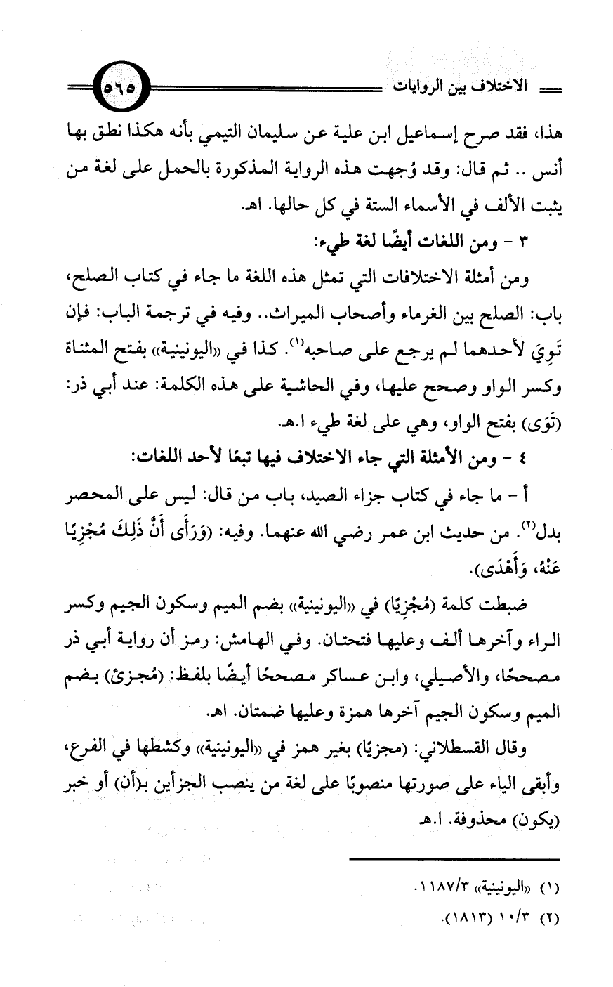 ومن أمثلة الاختلافات التي تمثل هذه اللغة ما جاء في كتاب الصلح، باب: الصلح بين الغرماء وأصحاب الميراث .. وفيه في ترجمة الباب: فإن تَوِيَ لأحدهما لم يرجع على صاحبه (¬1). كذا في «اليونينية» بفتح المثناة وكسر الواو وصحح عليها، وفي الحاشية على هذه الكلمة: عند أبي ذر: (تَوَى) بفتح الواو، وهي على لغة طيء ا. هـ.