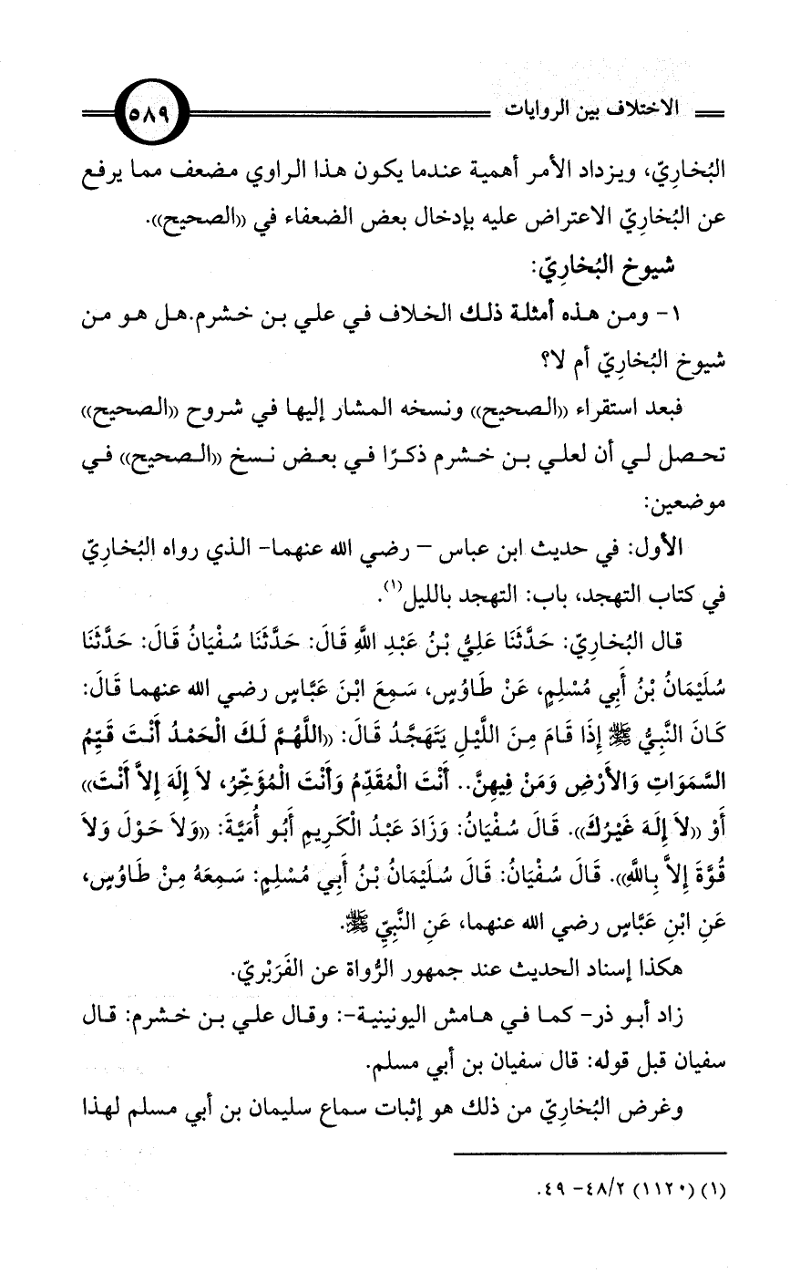 1 - ومن هذه أمثلة ذلك الخلاف في علي بن خشرم. هل هو من شيوخ البُخارِيّ أم لا؟