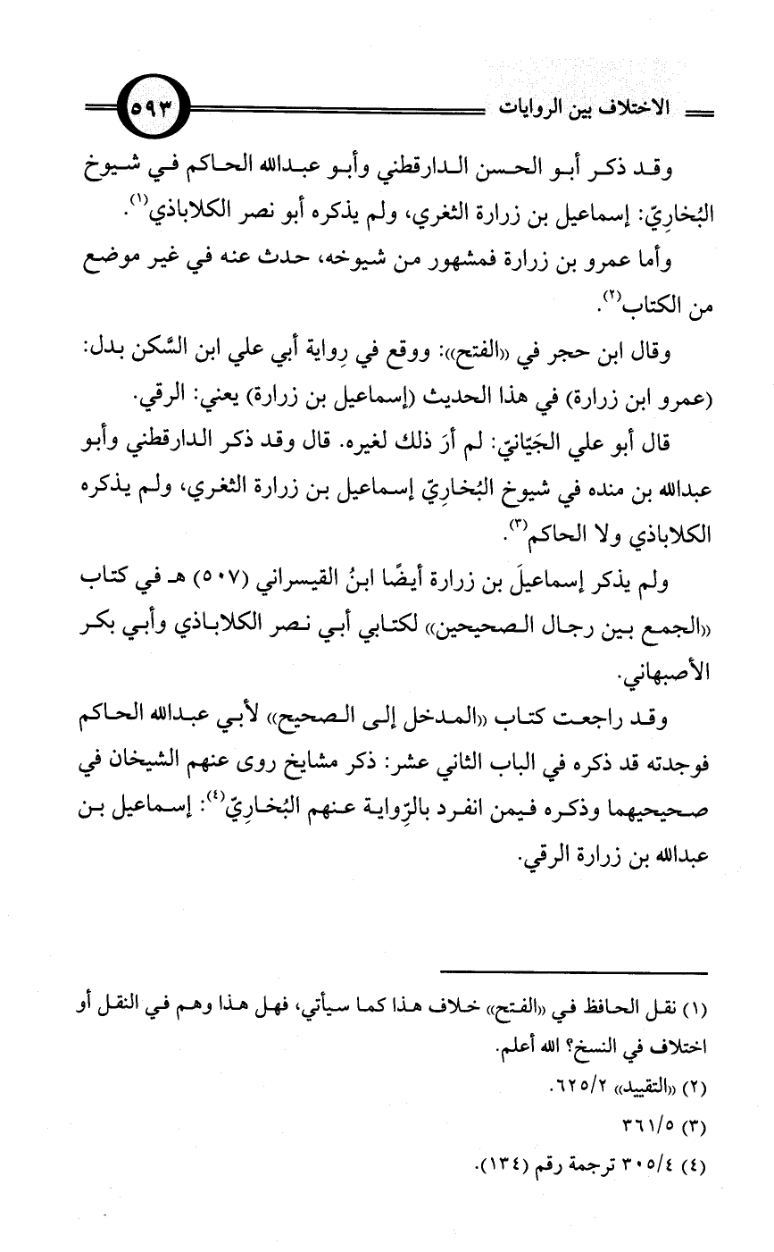 وقد ذكر أبو الحسن الدارقطني وأبو عبد الله الحاكم في شيوخ البُخارِيّ: إسماعيل بن زرارة الثغري، ولم يذكره أبو نصر الكلاباذي (¬1).
