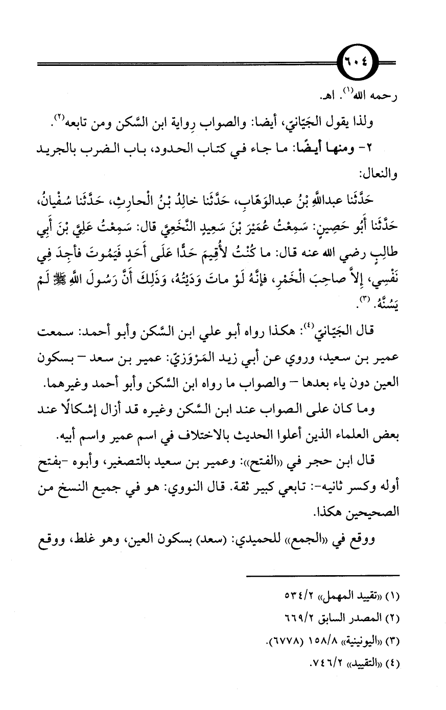 حَدَّثَنا عبد اللَّهِ بْنُ عبد الوَهّابِ، حَدَّثَنا خالِدُ بْنُ الْحارِثِ، حَدَّثَنا سُفْيانُ، حَدَّثَنا أَبُو حَصِينٍ: سَمِعْتُ عُمَيْرَ بْنَ سَعِيدٍ النَّخَعِيَّ قال: سَمِعْتُ عَلِيَّ بْنَ أَبِي طالِبٍ رضي الله عنه قال: ما كُنْتُ لأُقِيمَ حَدًّا عَلَى أَحَدٍ فَيَمُوتَ فأجِدَ فِي نَفْسِي، إِلاَّ صاحِبَ الْخَمْرِ، فإنَّهُ لَوْ ماتَ وَدَيْتُهُ، وَذَلِكَ أَنَّ رَسُولَ اللَّهِ - صلى الله عليه وسلم - لَمْ يَسُنَّهُ. (¬3).