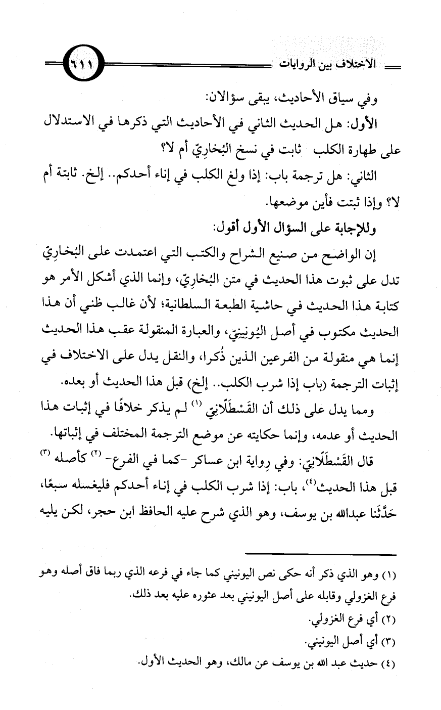 إن الواضح من صنيع الشراح والكتب التي اعتمدت على البُخارِيّ تدل على ثبوت هذا الحديث في متن البُخارِيّ، وإنما الذي أشكل الأمر هو كتابة هذا الحديث في حاشية الطبعة السلطانية؛ لأن غالب ظني أن هذا الحديث مكتوب في أصل اليُونِينِيّ، والعبارة المنقولة عقب هذا الحديث إنما هي منقولة من الفرعين الذين ذُكرا، والنقل يدل على الاختلاف في إثبات الترجمة (باب إذا شرب الكلب ... إلخ) قبل هذا الحديث أو بعده.