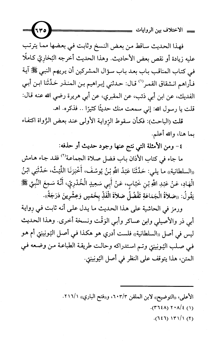 ما جاء في كتاب الأذان باب فضل صلاة الجماعة (¬2) فقد جاء هامش «السلطانية» ما يلي: حَدَّثَنَا عَبْدُ اللَّهِ بْنُ يُوسُفَ، أَخْبَرَنَا اللَّيْثُ، حَدَّثَنِي ابْنُ الْهَادِ، عَنْ عَبْدِ اللَّهِ بْنِ خَبَّابٍ، عَنْ أَبِي سَعِيدٍ الْخُدْرِيِّ، أَنَّهُ سَمِعَ النَّبِيَّ - صلى الله عليه وسلم - يَقُولُ: «صَلاَةُ الْجَمَاعَةِ تَفْضُلُ صَلاَةَ الْفَذِّ بِخَمْسٍ وَعِشْرِينَ دَرَجَةً».