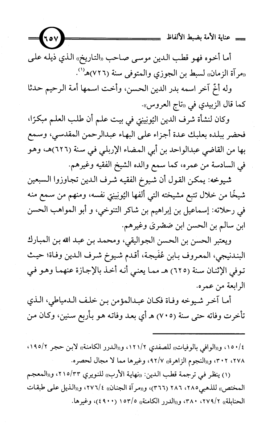 (¬1) ينظر في ترجمة قطب الدين: «نهاية الأرب» للنويري 33/ 215، و «المعجم المختص» للذهبي285، 286 (366)، و «مرآة الجنان» 4/ 276، و «الذيل على طبقات الحنابلة» 2/ 279، 380، و «الدرر الكامنة» 5/ 153 (4900)، وغيرها.