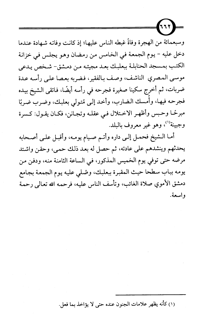 وسبعمائة من الهجرة وفاةً غبطه الناس عليها؛ إذ كانت وفاته شهادة عندما دخل عليه - يوم الجمعة في الخامس من رمضان وهو يجلس في خزانة الكتب بمسجد الحنابلة ببعلبك بعد مجيئه من دمشق - شخص يدعى موسى المصري الناشف، وصف بالفقير، فضربه بعصا على رأسه عدة ضربات، ثم أخرج سكينا صغيرة فجرحه في رأسه أيضًا، فاتقى الشيخ بيده فجرحه فيها، وأُمسك الضارب، وأخد إلى مُتولي بعلبك، وضرب ضربًا مبرحًا وحبس وأظهر الاختلال في عقله وتجانن، فكان يقول: كسرة وجبينة (¬1)، وهو غير معروف بالبلد.