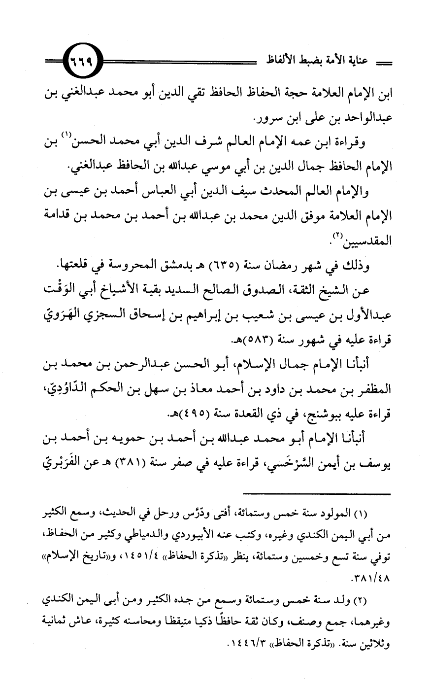 (¬2) ولد سنة خمس وستمائة وسمع من جده الكثير ومن أبى اليمن الكندي وغيرهما، جمع وصنف، وكان ثقة حافظًا ذكيا متيقظا ومحاسنه كثيرة، عاش ثمانية وثلاثين سنة. «تذكرة الحفاظ» 3/ 1446.
