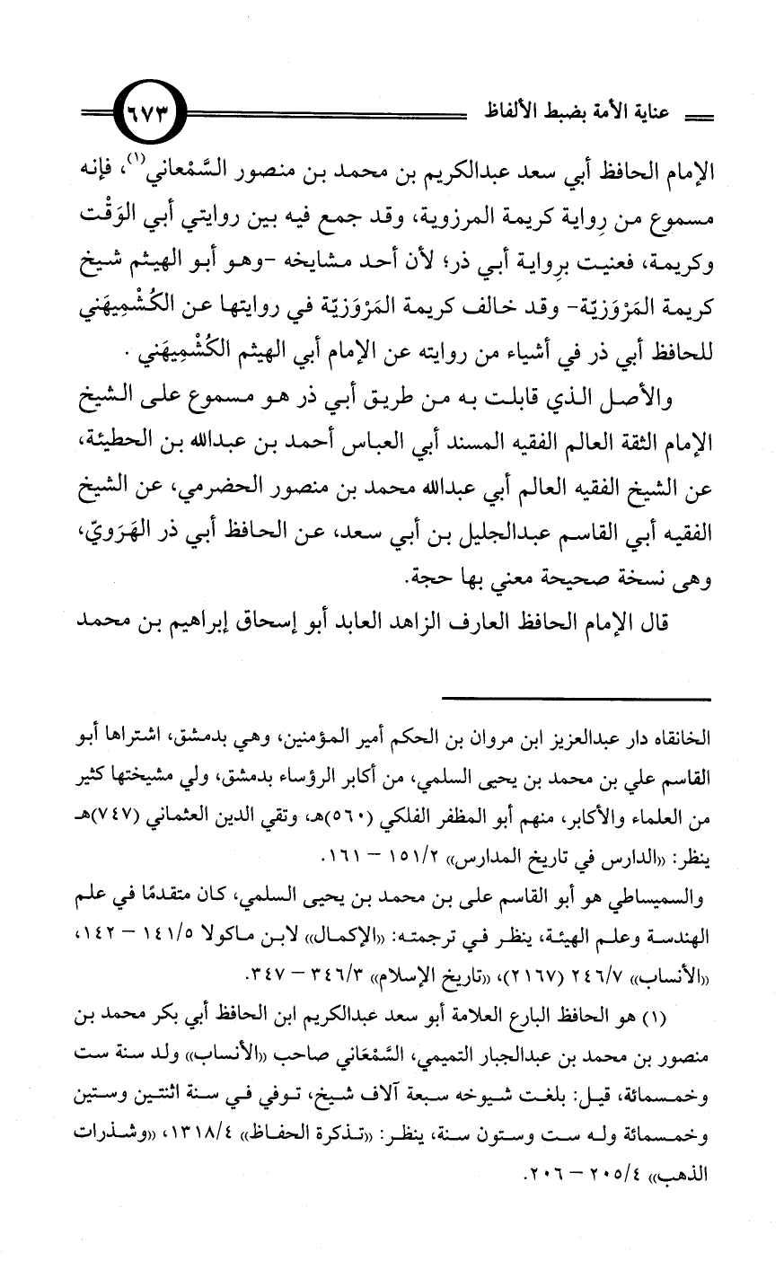 الإمام الحافظ أبي سعد عبد الكريم بن محمد بن منصور السَّمْعاني (¬1)، فإنه مسموع من رِواية كريمة المرزوية، وقد جمع فيه بين روايتي أبي الوَقْت وكريمة، فعنيت برِواية أبي ذر؛ لأن أحد مشايخه - وهو أبو الهيثم شيخ كريمة المَرْوَزيّة - وقد خالف كريمة المَرْوَزيّة في روايتها عن الكُشْمِيهَني للحافظ أبي ذر في أشياء من روايته عن الإمام أبي الهيثم الكُشْمِيهَني.
