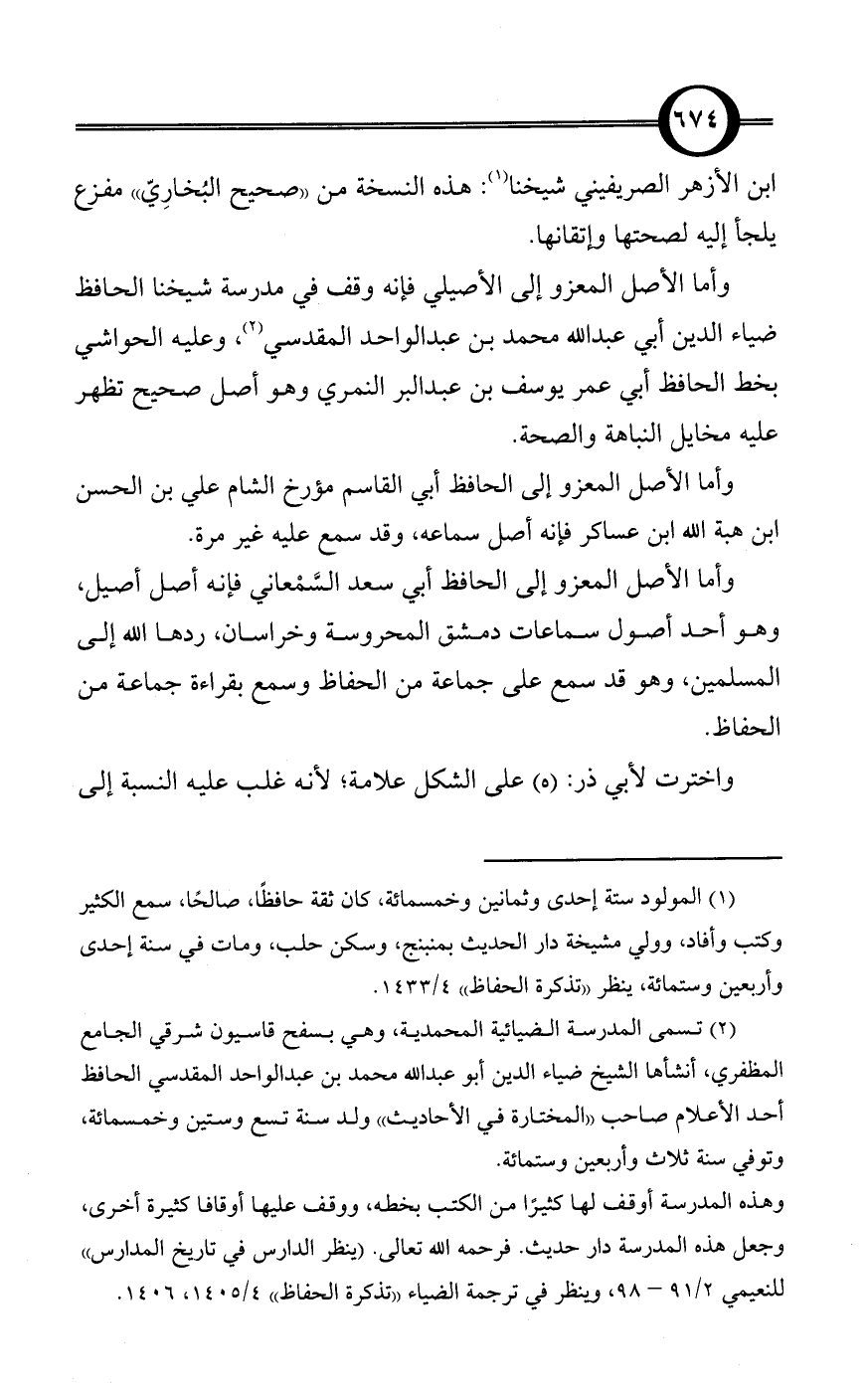 وأما الأصل المعزو إلى الأصيلي فإنه وقف في مدرسة شيخنا الحافظ ضياء الدين أبي عبد الله محمد بن عبد الواحد المقدسي (¬2)، وعليه الحواشي بخط الحافظ أبي عمر يوسف بن عبد البر النمري وهو أصل صحيح تظهر عليه مخايل النباهة والصحة.