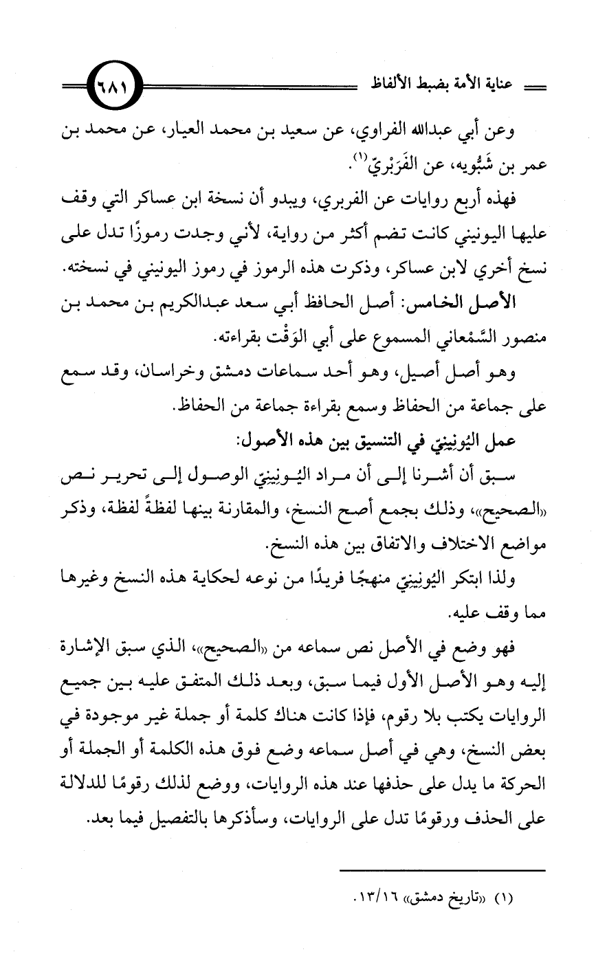 فهو وضع في الأصل نص سماعه من «الصحيح»، الذي سبق الإشارة إليه وهو الأصل الأول فيما سبق، وبعد ذلك المتفق عليه بين جميع الروايات يكتب بلا رقوم، فإذا كانت هناك كلمة أو جملة غير موجودة في بعض النسخ، وهي في أصل سماعه وضع فوق هذه الكلمة أو الجملة أو الحركة ما يدل على حذفها عند هذه الروايات، ووضع لذلك رقومًا للدلالة على الحذف ورقومًا تدل على الروايات، وسأذكرها بالتفصيل فيما بعد.
