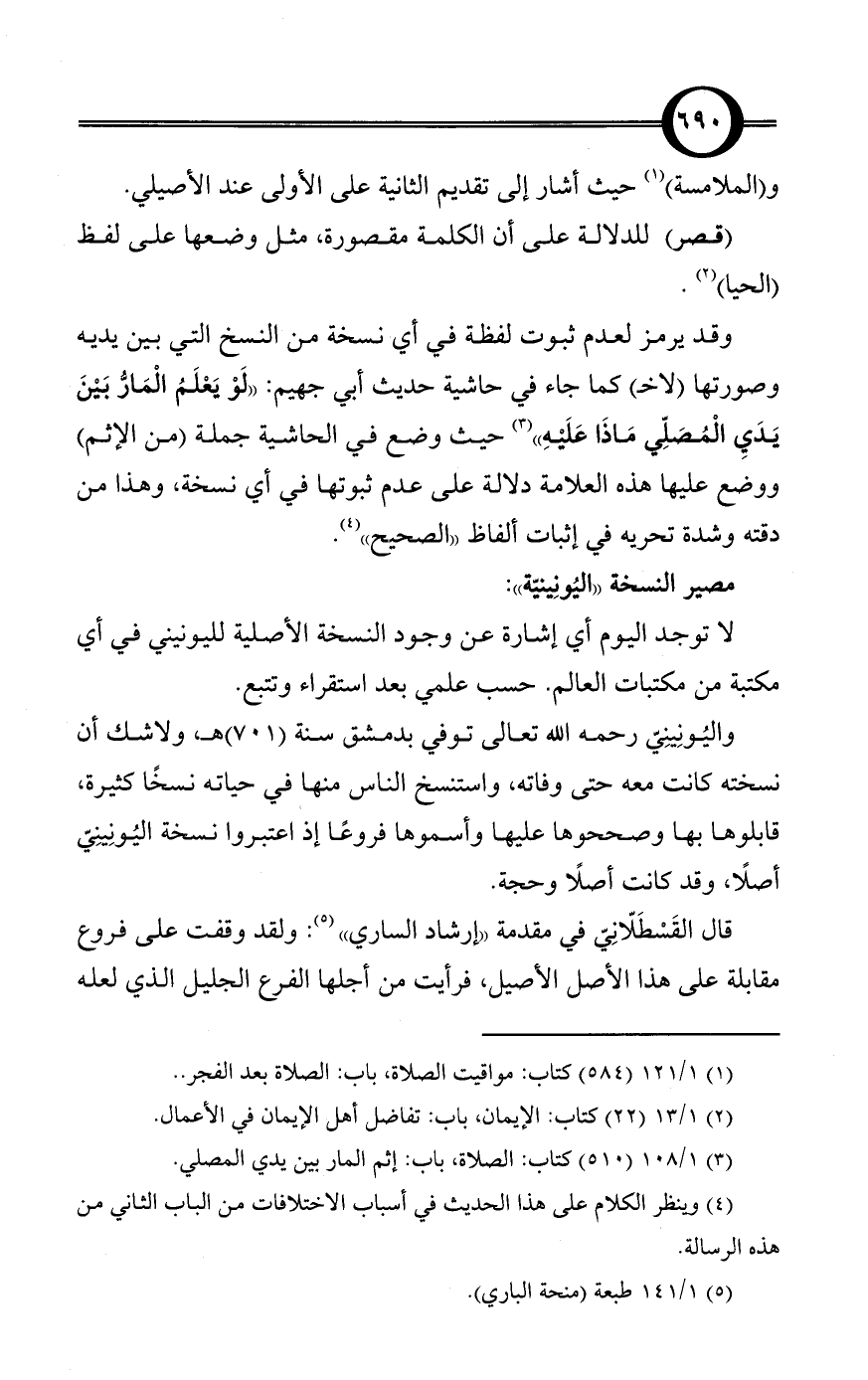 وقد يرمز لعدم ثبوت لفظة في أي نسخة من النسخ التي بين يديه وصورتها (لاخـ) كما جاء في حاشية حديث أبي جهيم: «لَوْ يَعْلَمُ الْمَارُّ بَيْنَ يَدَيِ الْمُصَلِّي مَاذَا عَلَيْهِ» (¬3) حيث وضع في الحاشية جملة (من الإثم) ووضع عليها هذه العلامة دلالة على عدم ثبوتها في أي نسخة، وهذا من دقته وشدة تحريه في إثبات ألفاظ «الصحيح» (¬4).
