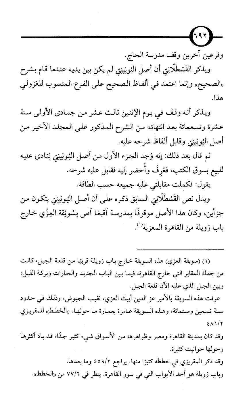 ويذكر أنه وقف في يوم الإثنين ثالث عشر من جمادى الأولى سنة عشرة وتسعمائة بعد انتهائه من الشرح المذكور على المجلد الأخير من أصل اليُونِينِيّ وقابل ألفاظ شرحه عليه.