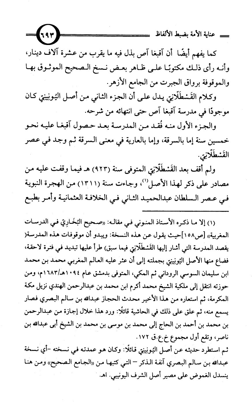 (¬1) إلا ما ذكره الأستاذ المنوني في مقاله: «صحيح البُخَارِيّ في الدرسات المغربية» [ص: 158] حيث يقول عن هذه النسخة: ويبدو أن موقوفات هذه المدرسة (يقصد المدرسة التي أشار إليها القَسْطَلّانِيّ فيما سبق) طرأ عليها تبديد في فترة لاحقة، فضاع منها الأصل اليُونِينِيّ بجملته إلى أن عثر عليه العالم المغربي محمد بن محمد بن سليمان السوسي الروداني ثم المكي، المتوفى بدمشق عام 1094 هـ / 1683 م، ومن حوزته انتقل إلى ملكية الشيخ محمد أكرم ابن محمد بن عبد الرحمن الهندي نزيل مكة المكرمة، ثم استعاره من هذا الأخير محدث الحجاز عبد الله بن سالم البصري فصار يسمع منه، ثم علق على ذلك في الحاشية قائلًا: ورد هذا خلال إجازة من عبد الرحمن بن محمد بن أحمد بن الحاج إلى محمد بن موسى بن محمد بن الشيخ أبى عبد الله بن ناصر، وتقع أول مجموع خ. ع. ق 172.
