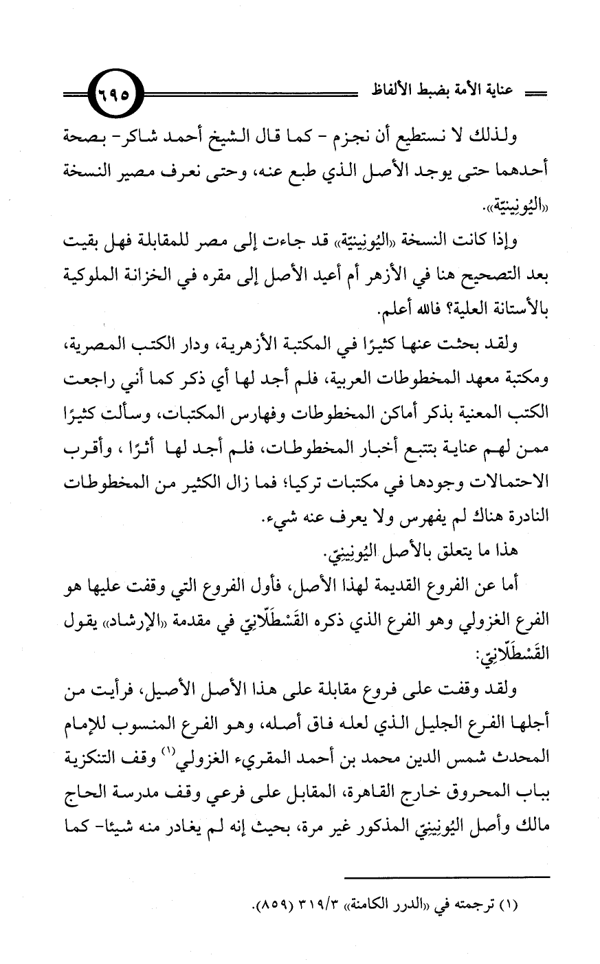 ولذلك لا نستطيع أن نجزم - كما قال الشيخ أحمد شاكر - بصحة أحدهما حتى يوجد الأصل الذي طبع عنه، وحتى نعرف مصير النسخة «اليُونِينيّة».