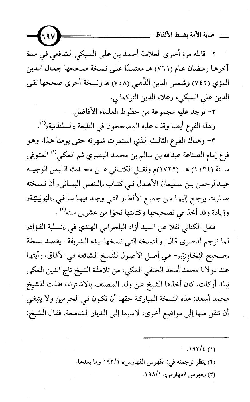 3 - وهناك الفرع الثالث الذي استمرت شهرته حتى يومنا هذا، وهو فرع إمام الصناعة عبد الله بن سالم بن محمد البصري ثم المكي (¬2) المتوفى سنة (1134) هـ (1722) م ونقل الكتاني عن محدث اليمن الوجيه عبد الرحمن بن سليمان الأهدل في كتاب «النفس اليمانى» أن نسخته صارت يرجع إليها من جميع الأقطار التي وجد فيها ما في «اليُونِينيّة» وزيادة وقد أخذ في تصحيحها وكتابتها نحوًا من عشرين سنة (¬3).
