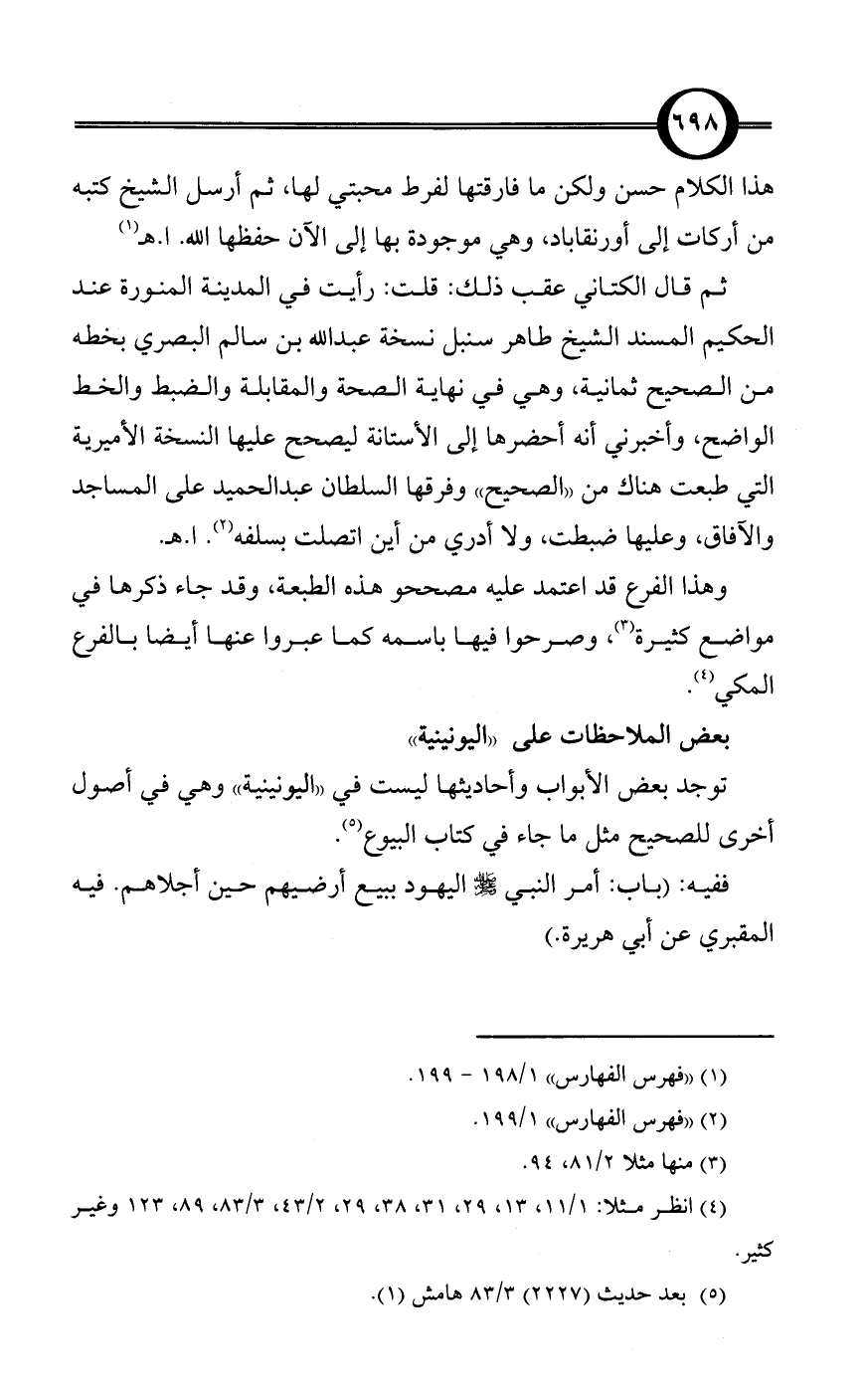 ثم قال الكتاني عقب ذلك: قلت: رأيت في المدينة المنورة عند الحكيم المسند الشيخ طاهر سنبل نسخة عبد الله بن سالم البصري بخطه من الصحيح ثمانية، وهي في نهاية الصحة والمقابلة والضبط والخط الواضح، وأخبرني أنه أحضرها إلى الأستانة ليصحح عليها النسخة الأميرية التي طبعت هناك من «الصحيح» وفرقها السلطان عبد الحميد على المساجد والآفاق، وعليها ضبطت، ولا أدري من أين اتصلت بسلفه (¬2). ا. هـ.