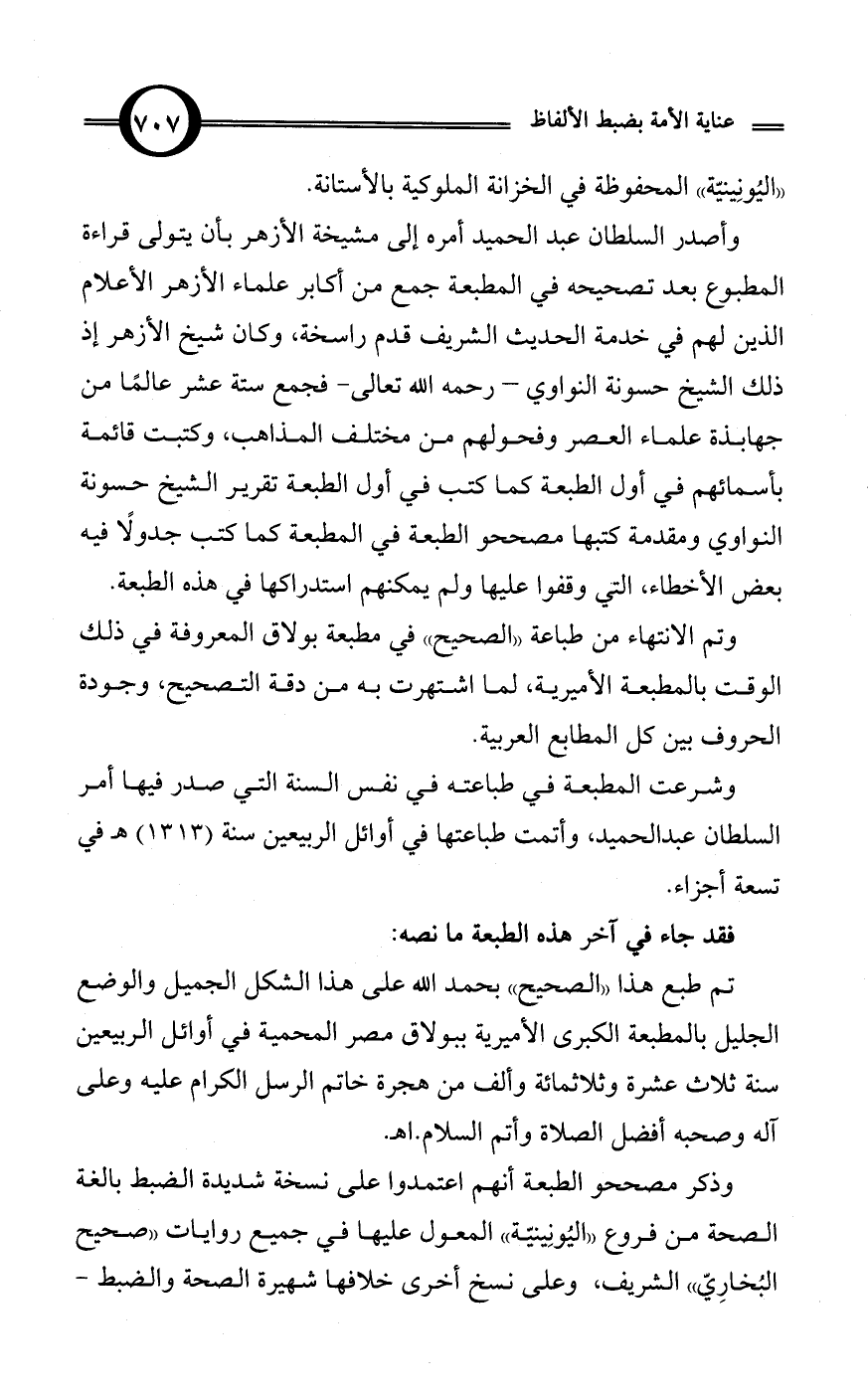 وأصدر السلطان عبد الحميد أمره إلى مشيخة الأزهر بأن يتولى قراءة المطبوع بعد تصحيحه في المطبعة جمع من أكابر علماء الأزهر الأعلام الذين لهم في خدمة الحديث الشريف قدم راسخة، وكان شيخ الأزهر إذ ذلك الشيخ حسونة النواوي - رحمه الله تعالى - فجمع ستة عشر عالمًا من جهابذة علماء العصر وفحولهم من مختلف المذاهب، وكتبت قائمة بأسمائهم في أول الطبعة كما كتب في أول الطبعة تقرير الشيخ حسونة النواوي ومقدمة كتبها مصححو الطبعة في المطبعة كما كتب جدولًا فيه بعض الأخطاء، التي وقفوا عليها ولم يمكنهم استدراكها في هذه الطبعة.