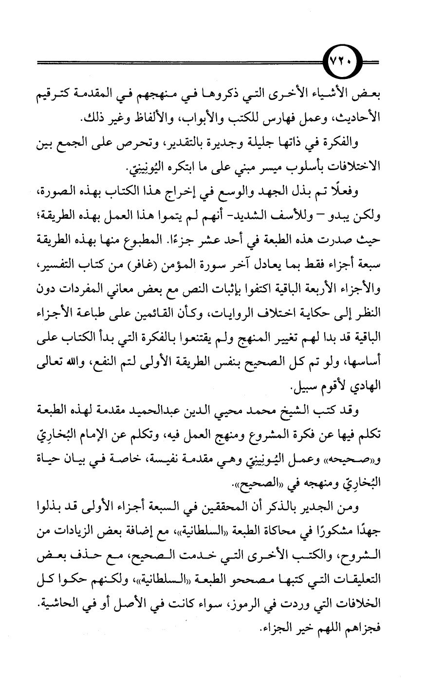 ومن الجدير بالذكر أن المحققين في السبعة أجزاء الأولى قد بذلوا جهدًا مشكورًا في محاكاة الطبعة «السلطانية»، مع إضافة بعض الزيادات من الشروح، والكتب الأخرى التي خدمت الصحيح، مع حذف بعض التعليقات التي كتبها مصححو الطبعة «السلطانية»، ولكنهم حكوا كل الخلافات التي وردت في الرموز، سواء كانت في الأصل أو في الحاشية. فجزاهم اللهم خير الجزاء.