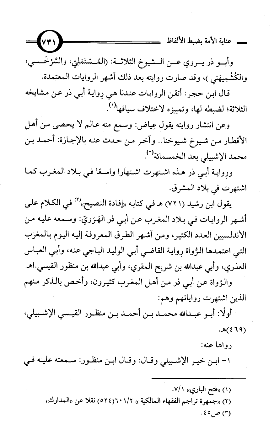 يقول ابن رشيد (721) هـ في كتابه «إفادة النصيح» (¬3) في الكلام على أشهر الروايات في بلاد المغرب عن أبي ذر الهَرَويّ: وسمعه عليه من الأندلسيين العدد الكثير، ومن أشهر الطرق المعروفة إليه اليوم بالمغرب التي اعتمدها الرُّواة رِواية القاضي أبي الوليد الباجي عنه، وأبي العباس العذري، وأبي عبد الله بن شريح المقري، وأبي عبد الله بن منظور القيسي. اهـ.