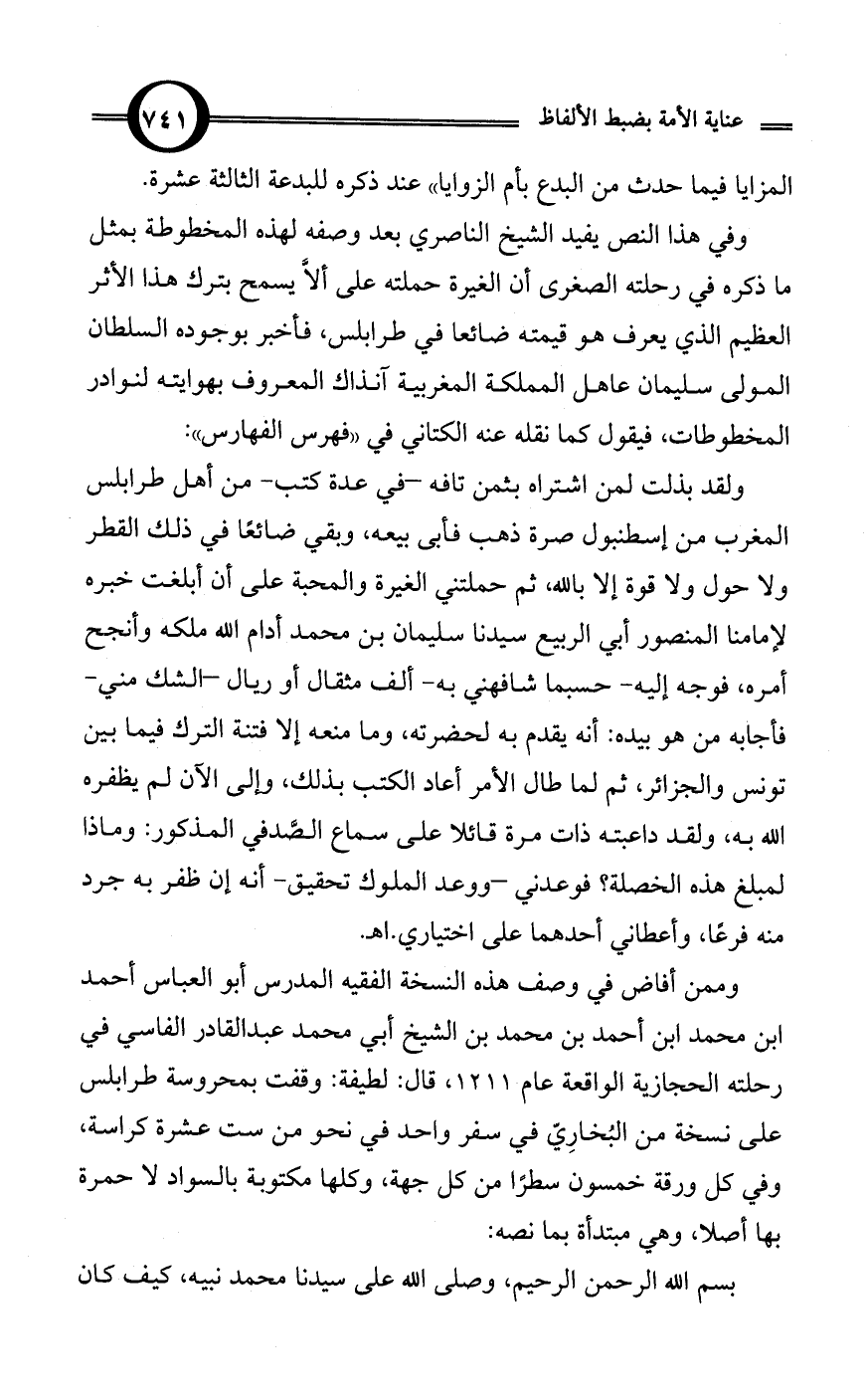 وفي هذا النص يفيد الشيخ الناصري بعد وصفه لهذه المخطوطة بمثل ما ذكره في رحلته الصغرى أن الغيرة حملته على ألاَّ يسمح بترك هذا الأثر العظيم الذي يعرف هو قيمته ضائعا في طرابلس، فأخبر بوجوده السلطان المولى سليمان عاهل المملكة المغربية آنذاك المعروف بهوايته لنوادر المخطوطات، فيقول كما نقله عنه الكتاني في «فهرس الفهارس»: