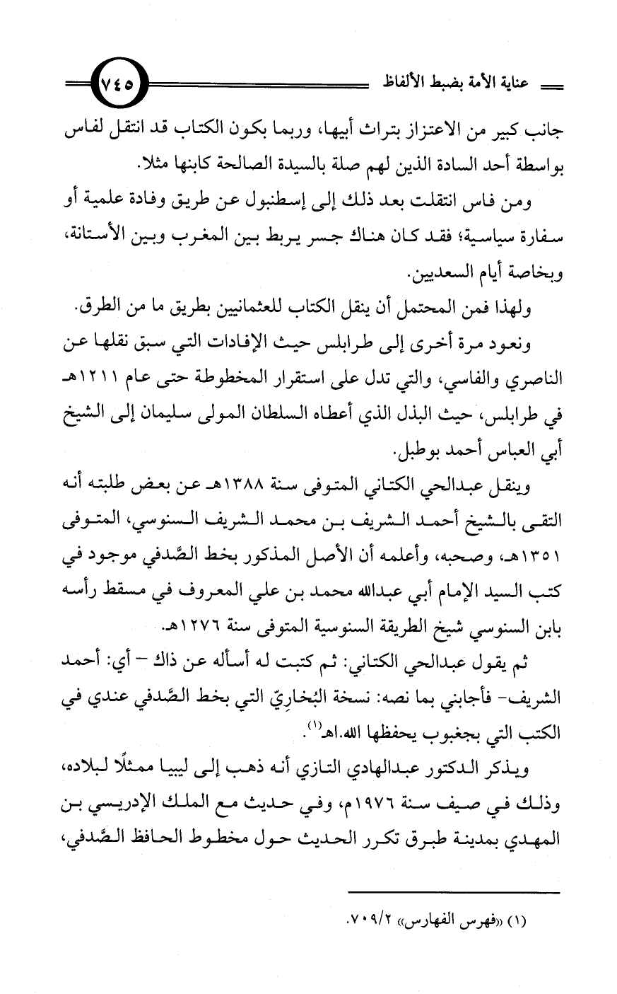 ويذكر الدكتور عبد الهادي التازي أنه ذهب إلى ليبيا ممثلًا لبلاده، وذلك في صيف سنة 1976 م، وفي حديث مع الملك الإدريسي بن المهدي بمدينة طبرق تكرر الحديث حول مخطوط الحافظ الصَّدفي،