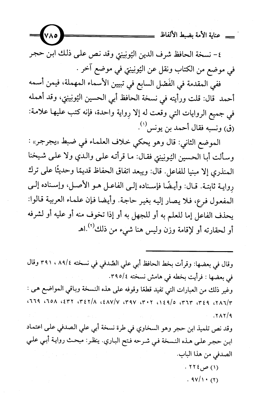 الموضع الثاني: قال وهو يحكي خلاف العلماء في ضبط «يجرجر»: وسألت أبا الحسين اليُونِينِيّ فقال: ما قرأته على والدي ولا على شيخنا المنذري إلا مبنيا للفاعل. قال: ويبعد اتفاق الحفاظ قديمًا وحديثًا على ترك رِواية ثابتة. قال: وأيضًا فإسناده إلى الفاعل هو الأصل، وإسناده إلى المفعول فرع، فلا يصار إليه بغير حاجة. وأيضا فإن علماء العربية قالوا: يحذف الفاعل إما للعلم به أو للجهل به أو إذا تخوف منه أو عليه أو لشرفه أو لحقارته أو لإقامة وزن وليس هنا شيء من ذلك (¬2).اهـ