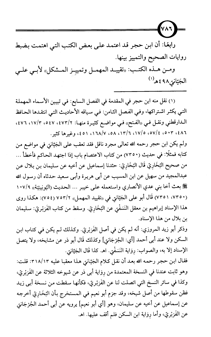 (¬1) نقل منه ابن حجر في المقدمة في الفصل السابع: في تبيين الأسماء المهملة التي يكثر اشتراكها، وفي الفصل الثامن: في سياقه الأحاديث التي انتقدها الحافظ الدارقطني ونقل في «الفتح» في مواضع كثيرة منها: 2/ 473، 547، 3/ 17، 476، 486، 503، 4/ 57، 5/ 17، 6/ 13، 58، 7/ 168، 451، وغيرها كثير.