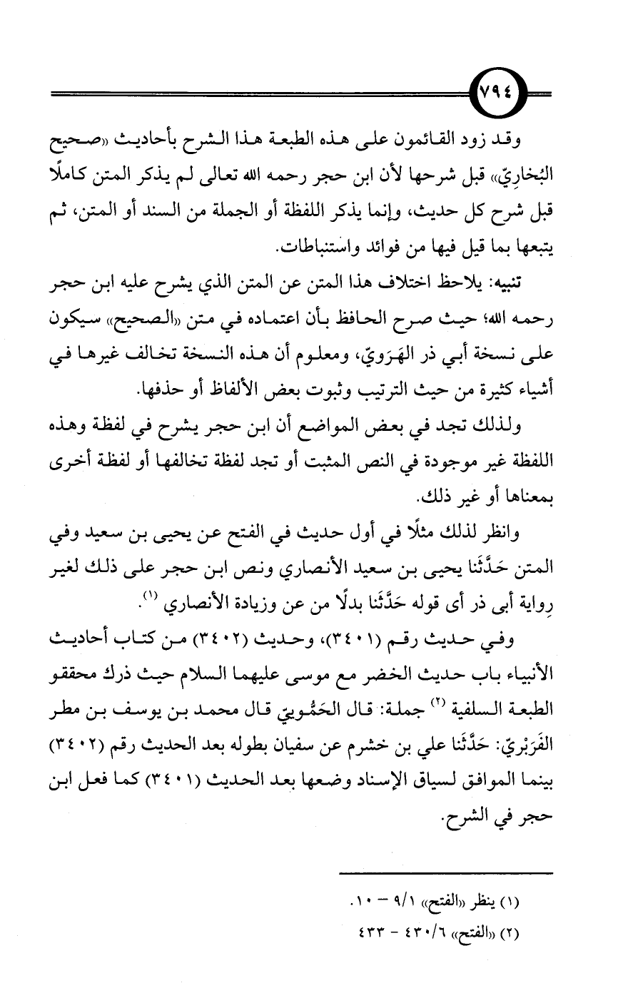 وفي حديث رقم (3401)، وحديث (3402) من كتاب أحاديث الأنبياء باب حديث الخضر مع موسى عليهما السلام حيث ذرك محققو الطبعة السلفية (¬2) جملة: قال الحَمُّوييّ قال محمد بن يوسف بن مطر الفَرَبْريّ: حَدَّثَنا علي بن خشرم عن سفيان بطوله بعد الحديث رقم (3402) بينما الموافق لسياق الإسناد وضعها بعد الحديث (3401) كما فعل ابن حجر في الشرح.