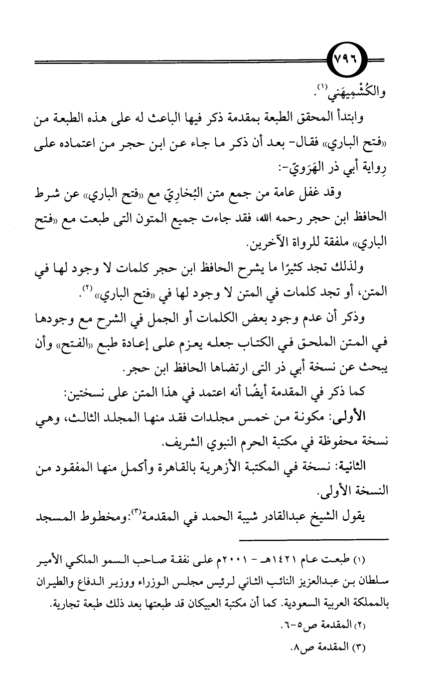 وابتدأ المحقق الطبعة بمقدمة ذكر فيها الباعث له على هذه الطبعة من «فتح الباري» فقال - بعد أن ذكر ما جاء عن ابن حجر من اعتماده على رِواية أبي ذر الهَرَويّ -: