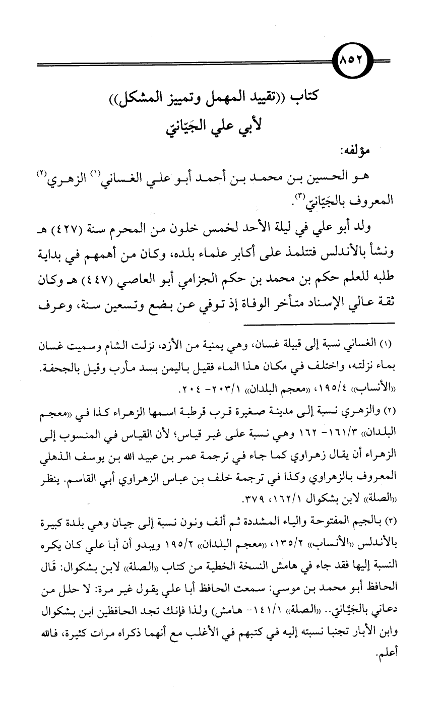 (¬3) بالجيم المفتوحة والياء المشددة ثم ألف ونون نسبة إلى جيان وهي بلدة كبيرة بالأندلس «الأنساب» 2/ 135، «معجم البلدان» 2/ 195 ويبدو أن أبا علي كان يكره النسبة إليها فقد جاء في هامش النسخة الخطية من كتاب «الصلة» لابن بشكوال: قَال الحافظ أبو محمد بن موسي: سمعت الحافظ أبا علي يقول غير مرة: لا حلل من دعاني بالجَيَّانيّ .. «الصلة» 1/ 141 - هامش) ولذا فإنك تجد الحافظين ابن بشكوال وابن الأبار تجنبا نسبته إليه في كتبهم في الأغلب مع أنهما ذكراه مرات كثيرة، فالله أعلم.