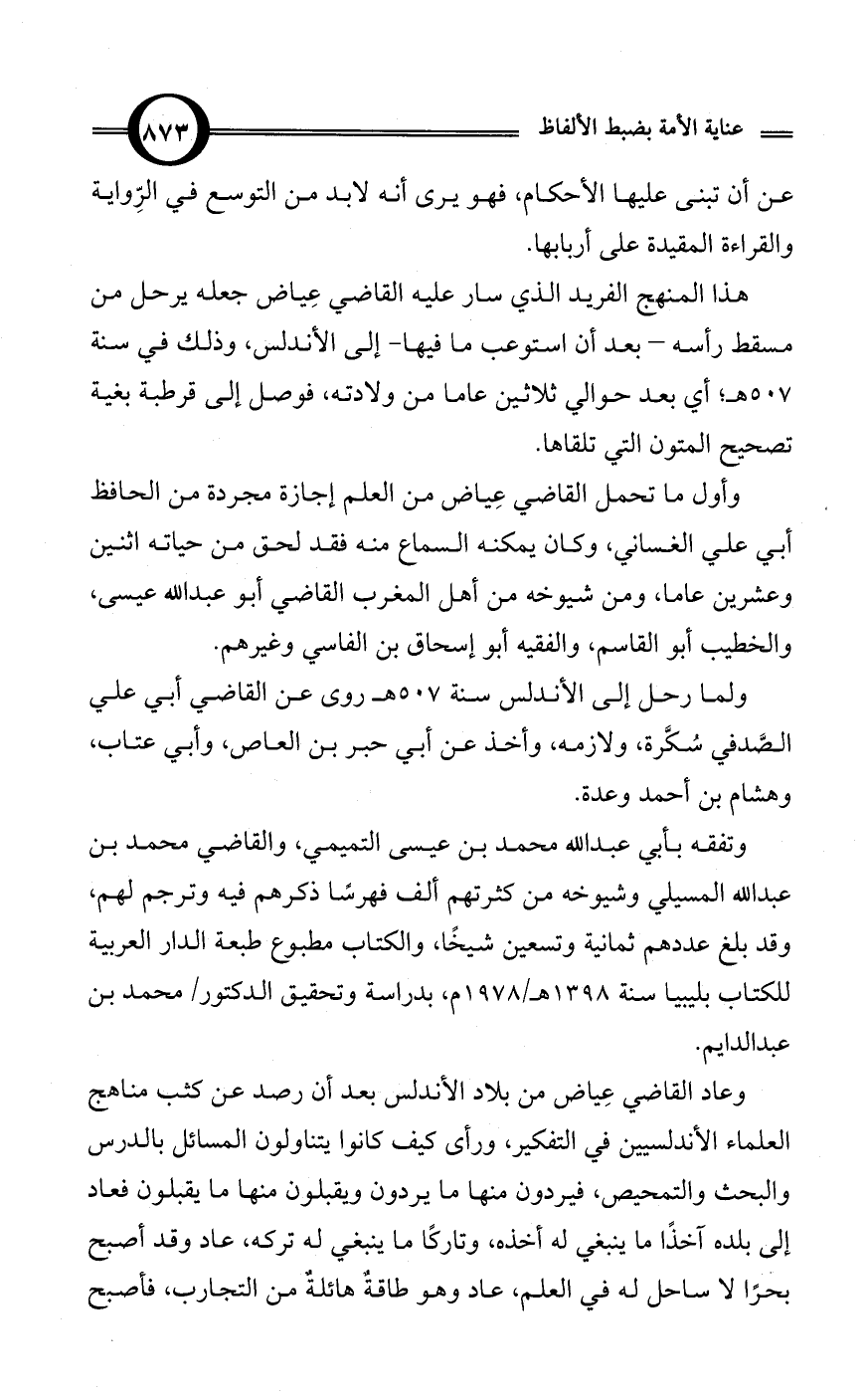 هذا المنهج الفريد الذي سار عليه القاضي عِياض جعله يرحل من مسقط رأسه - بعد أن استوعب ما فيها - إلى الأندلس، وذلك في سنة 507 هـ؛ أي بعد حوالي ثلاثين عاما من ولادته، فوصل إلى قرطبة بغية تصحيح المتون التي تلقاها.