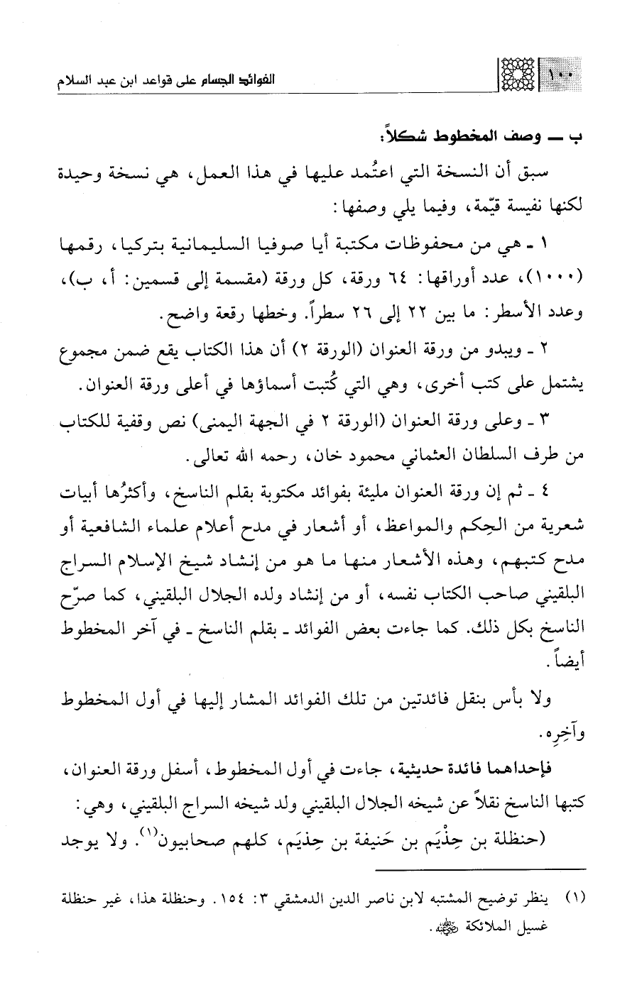 سبق أن النسخة التي اعتُمد عليها في هذا العمل، هي نسخة وحيدة لكنها نفيسة قيّمة، وفيما يلي وصفها: