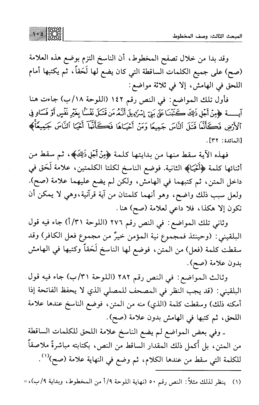فهذه الآية سقط منها من بدايتها كلمة {مِنْ أَجْلِ ذَلِكَ}، ثم سقط من أثنائها كلمة {أَحْيَا} الثانية. فوضع الناسخ لكلتا الكلمتين، علامة لَحَق في داخل المتن، ثم كتبهما في الهامش، ولكن لم يضع عليهما علامة (صح). ولعل سبب ذلك واضح، وهو أنهما كلمتان من آية قرآنية، وهي لا يمكن أن تكون إلا هكذا، فلا داعي لعلامة (صح) هنا.