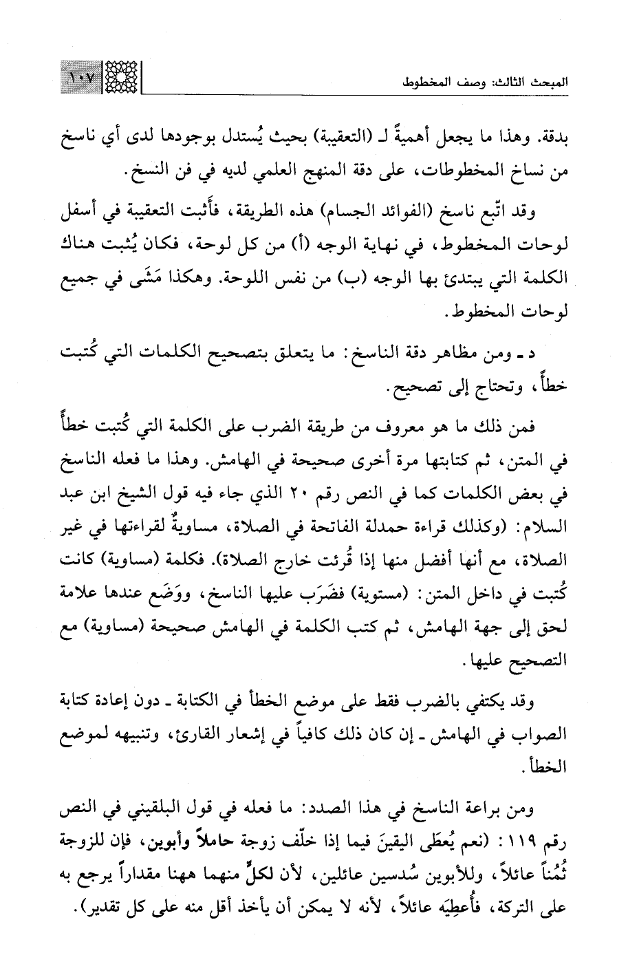 فمن ذلك ما هو معروف من طريقة الضرب على الكلمة التي كُتبت خطأً في المتن، ثم كتابتها مرة أخرى صحيحة في الهامش. وهذا ما فعله الناسخ في بعض الكلمات كما في النص رقم 20 الذي جاء فيه قول الشيخ ابن عبد السلام: (وكذلك قراءة حمدلة الفاتحة في الصلاة، مساوية لقراءتها في غير الصلاة، مع أنها أفضل منها إذا قُرئت خارج الصلاة). فكلمة (مساوية) كانت كُتبت في داخل المتن: (مستوية) فضَرَب عليها الناسخ، ووَضَع عندها علامة لحق إلى جهة الهامش، ثم كتب الكلمة في الهامش صحيحة (مساوية) مع التصحيح عليها.