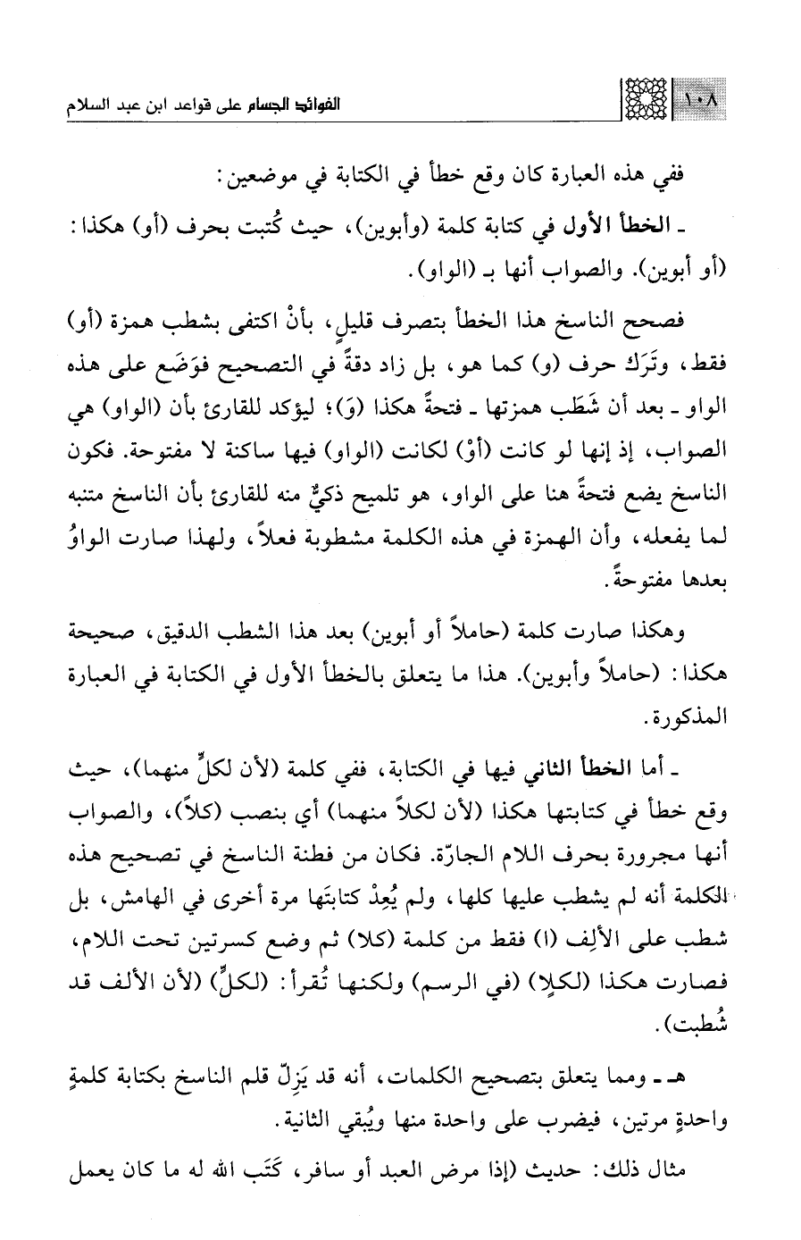 - أما الخطأ الثاني فيها في الكتابة، ففي كلمة (لأن لكلٍّ منهما)، حيث وقع خطأ في كتابتها هكذا (لأن لكلًا منهما) أي بنصب (كلًّا)، والصواب أنها مجرورة بحرف اللام الجارّة. فكان من فطنة الناسخ في تصحيح هذه الكلمة أنه لم يشطب عليها كلها، ولم يُعِدْ كتابتَها مرة أخرى في الهامش، بل شطب على الألِف (1) فقط من كلمة (كلا) ثم وضع كسرتين تحت اللام، فصارت هكذا (لكلٍا) (في الرسم) ولكنها تُقرأ: (لكلٍّ) (لأن الألف قد شُطبت).
