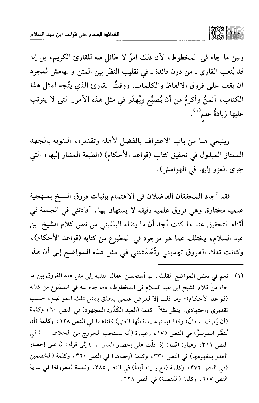 وينبغي هنا من باب الاعتراف بالفضل لأهله وتقديره، التنويه بالجهد الممتاز المبذول في تحقيق كتاب (قواعد الأحكام) (الطبعة المشار إليها، التي جرى العزو إليها في الهوامش).