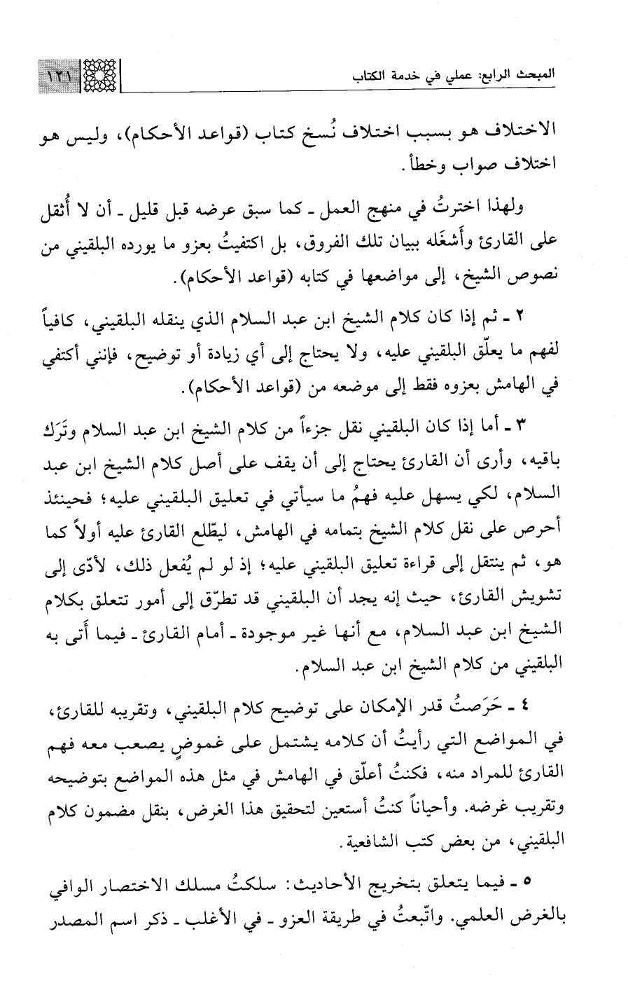 ولهذا اخترتُ في منهج العمل -كما سبق عرضه قبل قليل- أن لا أُثقل على القارئ وأَشغَله ببيان تلك الفروق، بل اكتفيتُ بعزو ما يورده البلقيني من نصوص الشيخ، إلى مواضعها في كتابه (قواعد الأحكام).