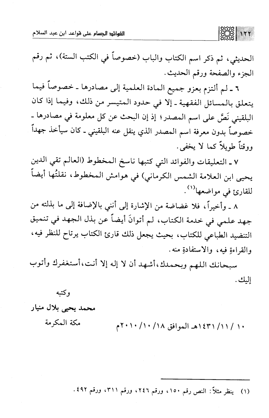 8 - وأخيرًا، فلا غضاضة من الإشارة إلى أنني بالإضافة إلى ما بذلته من جهد علمي في خدمة الكتاب، لم أتوانَ أيضًا عن بذل الجهد في تنميق التنضيد الطباعي للكتاب، بحيث يجعل ذلك قارئ الكتاب يرتاح للنظر فيه، والقراءة فيه، والاستفادةِ منه.