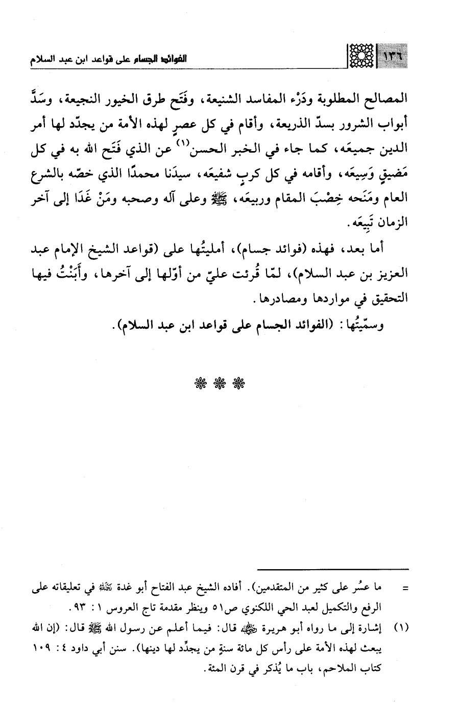 أما بعد، فهذه (فوائد جسام)، أمليتُها على (قواعد الشيخ الإمام عبد العزيز بن عبد السلام)، لمّا قُرئت عليّ من أوّلها إلى آخرها، وأَبَنْتُ فيها التحقيق في مواردها ومصادرها.
