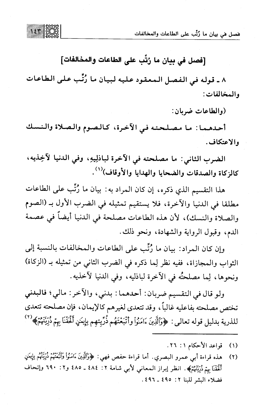 وإن كان المراد: بيان ما رُتِّب على الطاعات والمخالفات بالنسبة إلى الثواب والمجازاة، ففيه نظر لِما ذكره في الضرب الثاني من تمثيله بـ (الزكاة) ونحوها، لِما مصلحتُه في الآخرة لباذليه، وفي الدنيا لآخذيه.