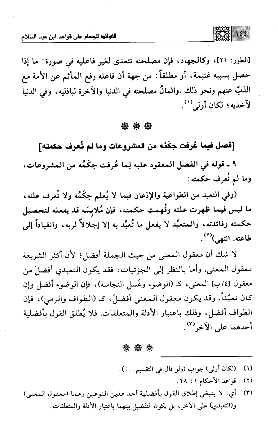 9 - قوله في الفصل المعقود عليه لِما عُرفت حِكَمُه من المشروعات، وما لم تُعرف حكمته: