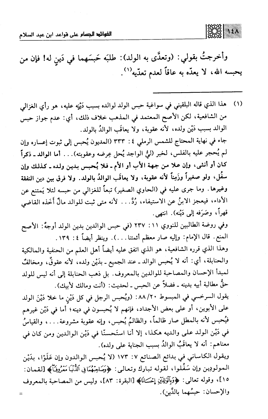 (¬1) هذا الذي قاله البلقيني في سواغية حبس الولد لوالده بسبب دَيْنه عليه، هو رأي الغزالي من الشافعية، لكن الأصح المعتمد في المذهب خلاف ذلك، أي: عدم جواز حبس الوالد بسبب دَيْن ولده، لأنه عقوبة، ولا يعاقَب الوالدُ بالولد.