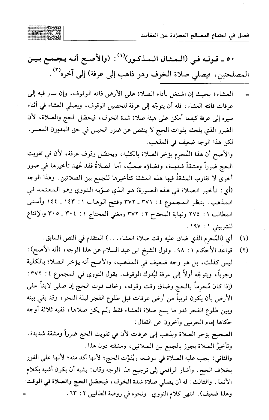 50 - قوله في (المثال المذكور) (¬1): (والأصح أنه يجمع بين المصلحتين، فيصلي صلاة الخوف وهو ذاهب إلى عرفة) إلى آخره (¬2).