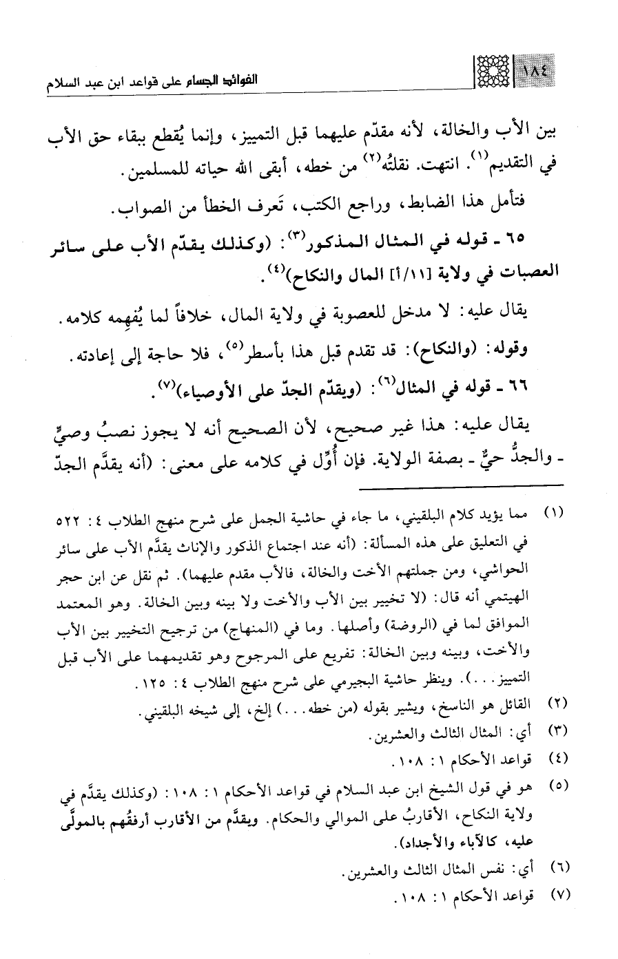 (¬5) هو في قول الشيخ ابن عبد السلام في قواعد الأحكام 1: 108: (وكذلك يقدَّم في ولاية النكاح، الأقاربُ على الموالي والحكام. ويقدَّم من الأقارب أرفقُهم بالمولَّى عليه، كالآباء والأجداد).