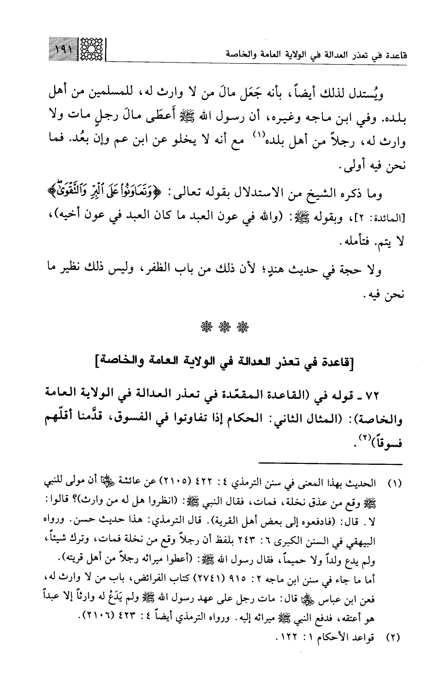 72 - قوله في (القاعدة المقعّدة في تعذر العدالة في الولاية العامة والخاصة): (المثال الثاني: الحكام إذا تفاوتوا في الفسوق، قدَّمنا أقلّهم فسوقًا) (¬2).