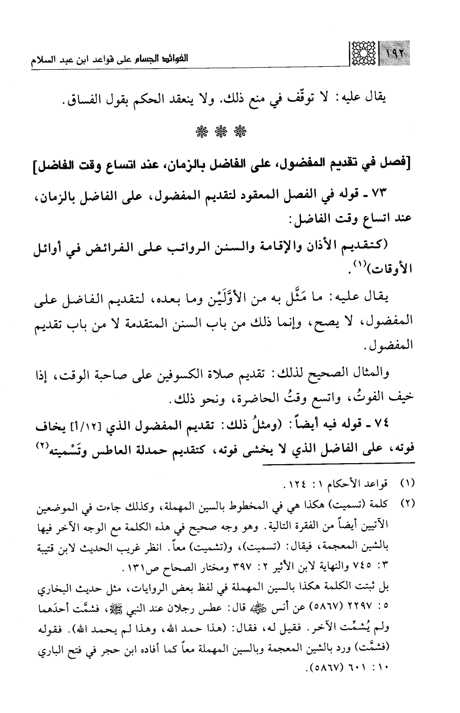 74 - قوله فيه أيضًا: (ومثلُ ذلك: تقديم المفضول الذي يخاف فوته، على الفاضل الذي لا يخشى فوته، كتقديم حمدلة العاطس وتَسْميته (¬2)