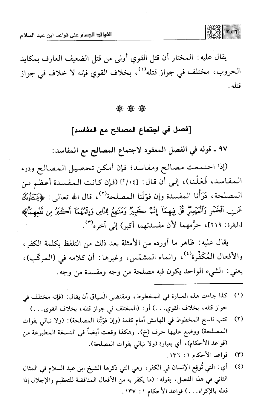 (¬2) كتب ناسخ المخطوط في الهامش أمام كلمة (وإن فوّتْنا المصلحة): (ولا نبالي بفوات المصلحة) ووضع عليها حرف (خ). وهكذا وقعت أيضًا في النسخة المطبوعة من (قواعد الأحكام)، أي بعبارة (ولا نبالي بفوات المصلحة).