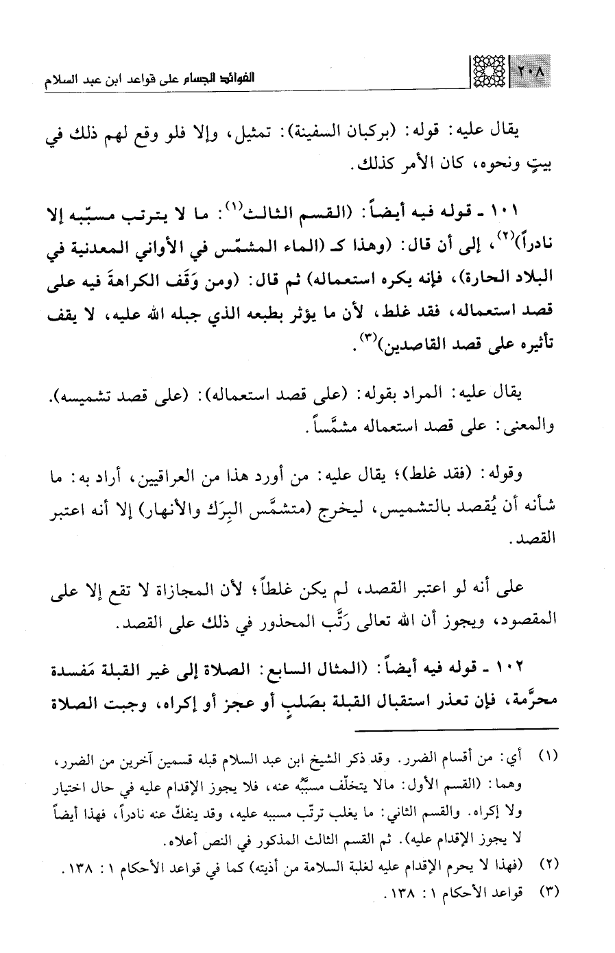 101 - قوله فيه أيضًا: (القسم الثالث (¬1): ما لا يترتب مسبّبه إلا نادرًا) (¬2)، إلى أن قال: (وهذا كـ (الماء المشمّس في الأواني المعدنية في البلاد الحارة)، فإنه يكره استعماله) ثم قال: (ومن وَقَف الكراهةَ فيه على قصد استعماله، فقد غلط، لأن ما يؤثر بطبعه الذي جبله الله عليه، لا يقف تأثيره على قصد القاصدين) (¬3).