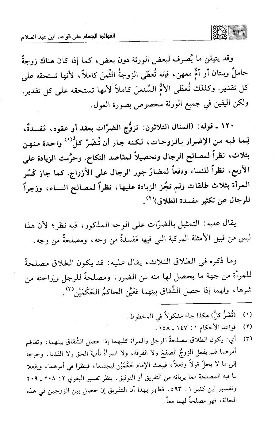 120 - قوله: (المثال الثلاثون: تزوُّج الضرّات بعقد أو عقود، مَفسدةٌ، لِما فيه من الإضرار بالزوجات، لكنه جاز أن تُضَرّ كلُّ (¬1) واحدة منهن بثلاث، نظرًا لمصالح الرجال وتحصيلًا لمقاصد النكاح. وحرُمت الزيادة على الأربع، نظرًا للنساء ودفعًا لمضارّ جور الرجال على الأزواج. كما جاز كَسْر المرأة بثلاث طلقات ولم تجُز الزيادة عليها، نظرًا لمصالح النساء، وزجرًا للرجال عن تكثير مفسدة الطلاق) (¬2).
